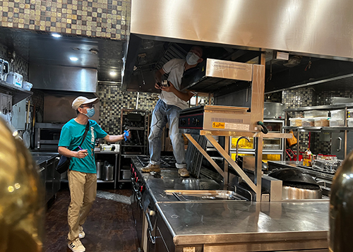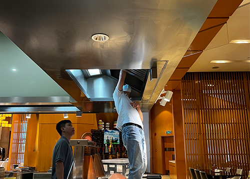 将厨房老化的新风系统利旧使用,达到了加快厨房空气循环、降低作业环境温度的效果,